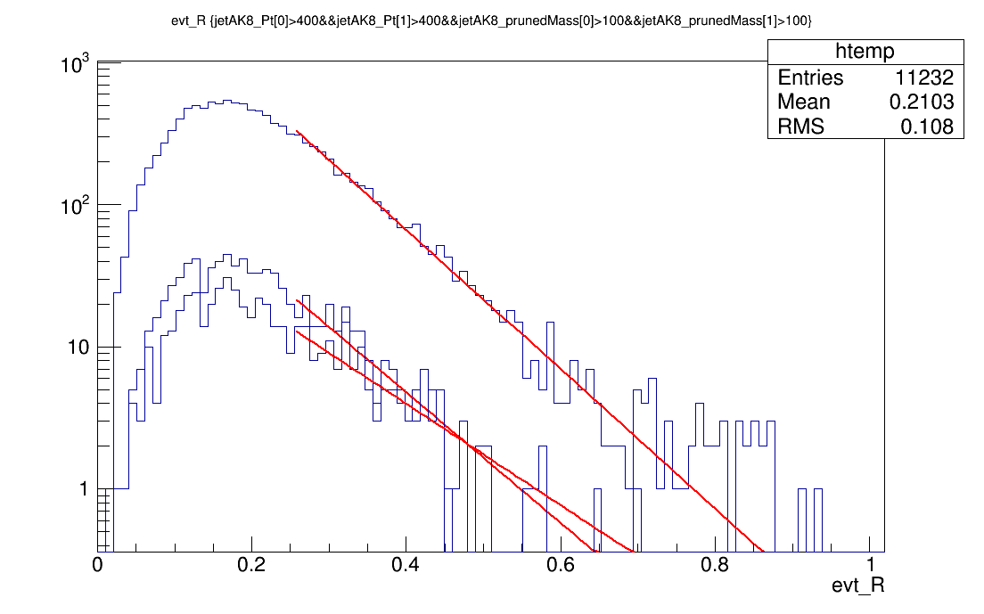 R shape fit with exponential in the Ntop<2 sideband and NTop==2 signal bands. Range [0.15,1.0] for sideband, [0.15,0.4] for signal band. |