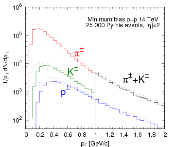 Caption: Reconstructed raw pT distribution of produced particles in 25 000 minimum bias p+p events at 14 TeV energy from Pythia generator (left); and in 125 central Pb+Pb events at 5.5 TeV/nucleon energy from Hydjet generator (right). (In order to roughly match the amount of produced particles in the p+p plot, the spectra have been scaled up from 25 events with a straightforward procedure.) Pions, kaons and protons are shown separately. Simulated spectra are given with dotted lines.